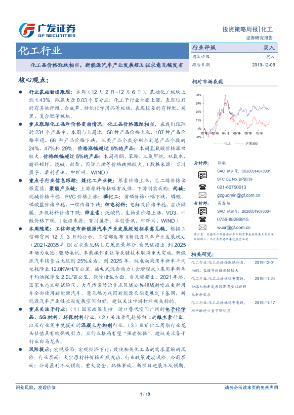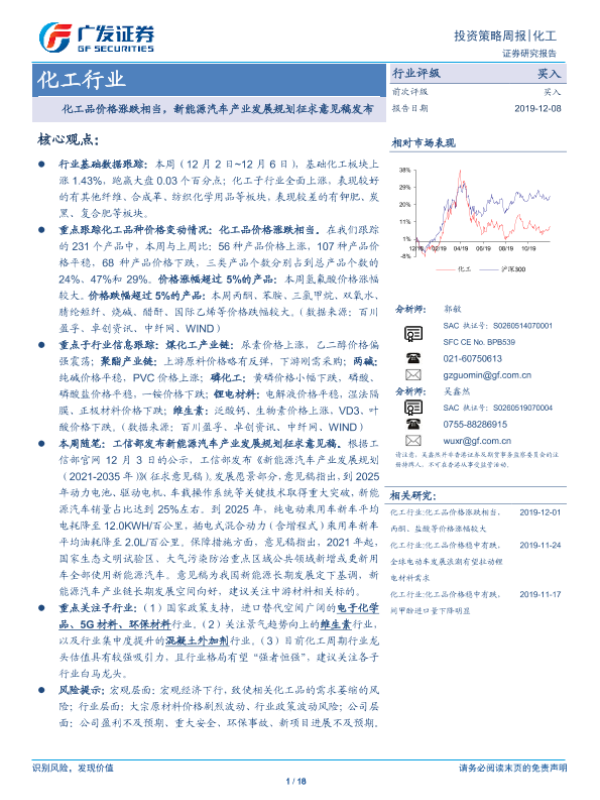 【广发证券】【20191208】20191208-广发证券-化工行业投资策略周报:化工品价格涨跌相当,新能源汽车产业发展规划征求意见稿发布-18页