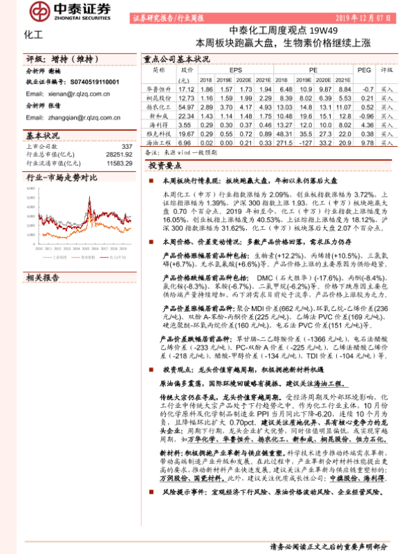 【中泰证券】【20191207】中泰化工周度观点19W49:本周板块跑赢大盘,生物素价格继续上涨-21页