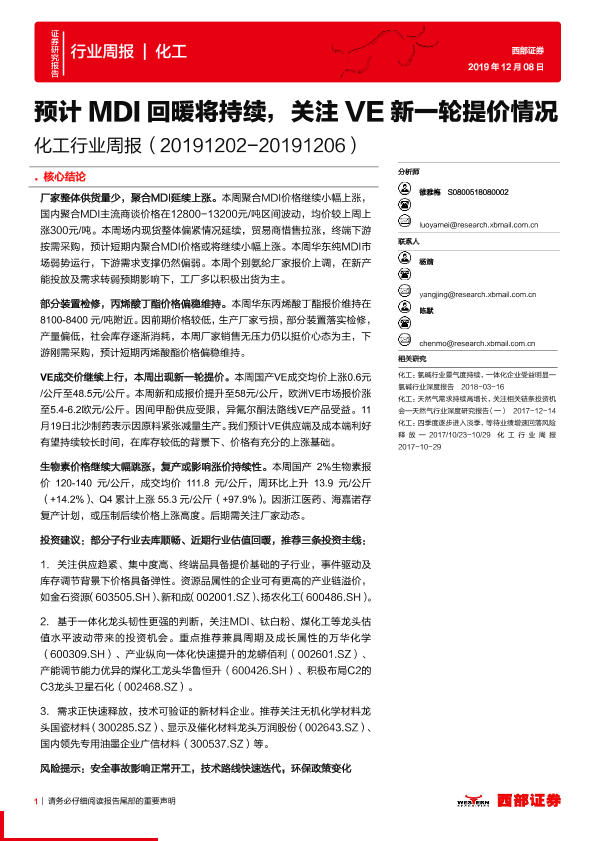 【西部证券】【20191208】20191208-西部证券-化工行业周报:预计MDI回暖将持续,关注VE新一轮提价情况-14页