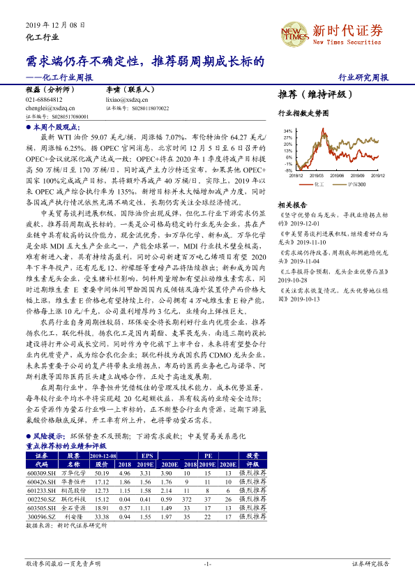 【新时代证券】【20191208】20191208-新时代证券-化工行业周报:需求端仍存不确定性,推荐弱周期成长标的-29页
