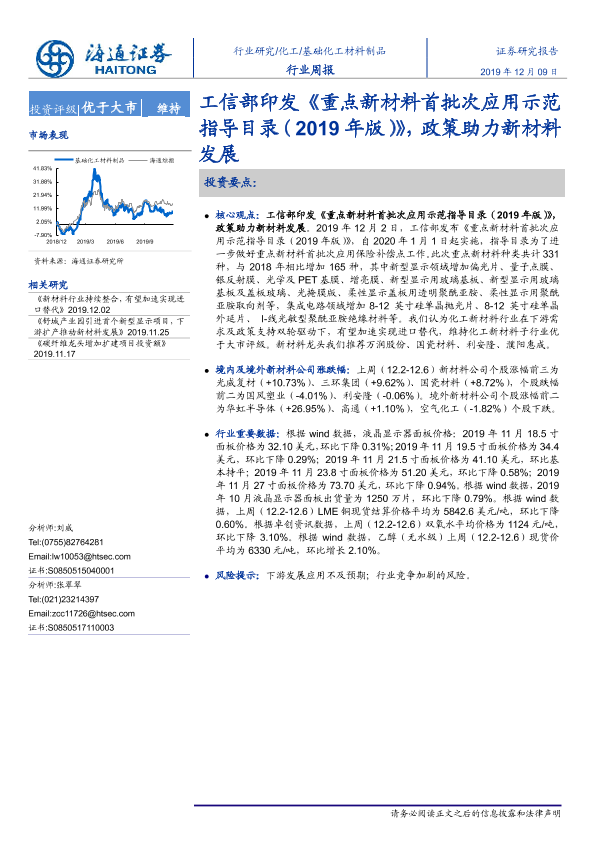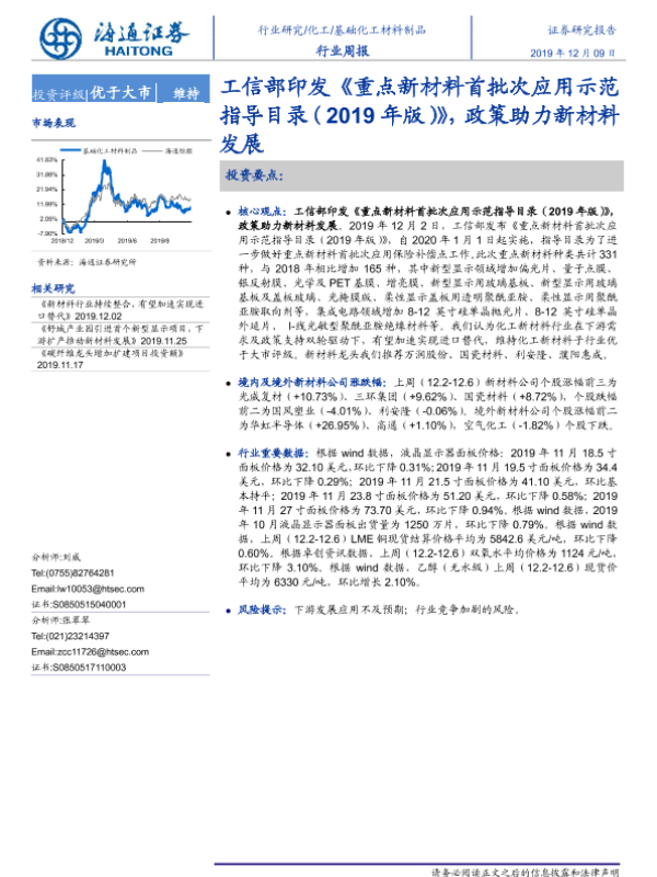 【海通证券】【20191209】基础化工材料制品行业周报:工信部印发《重点新材料首批次应用示范指导目录(2019年版)》,政策助力新材料发展-8页