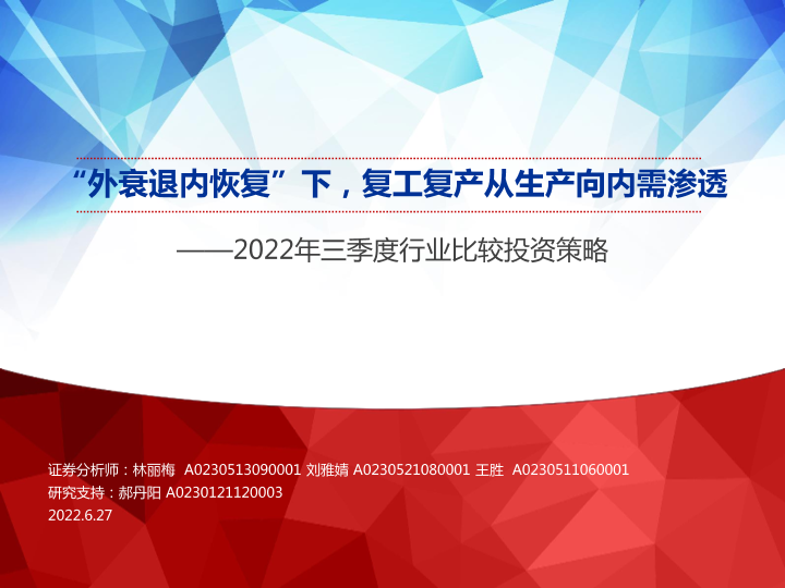 【申万宏源】【20220627】2022年三季度行业比较投资策略:“外衰退内恢复”下,复工复产从生产向内需渗透-77页