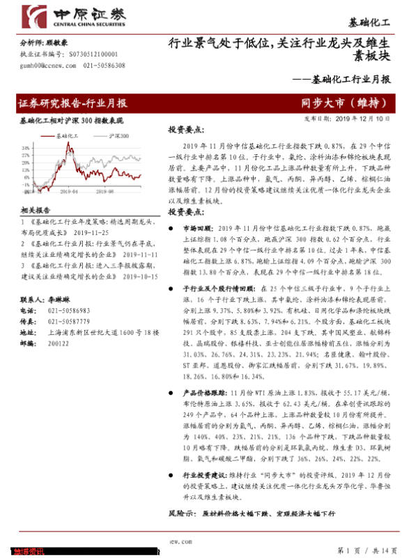【中原证券】【20191210】基础化工行业月报:行业景气处于低位,关注行业龙头及维生素板块-14页