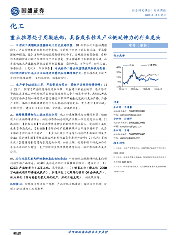 【国盛证券】【20191215】化工行业周报:重点推荐处于周期底部,具备成长性及产业链延伸力的行业龙头-6页