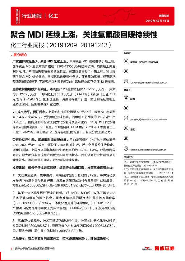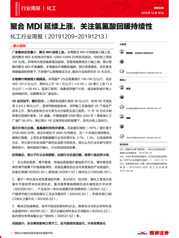 【西部证券】【20191215】20191215-西部证券-化工行业周报:聚合MDI延续上涨,关注氢氟酸回暖持续性-16页