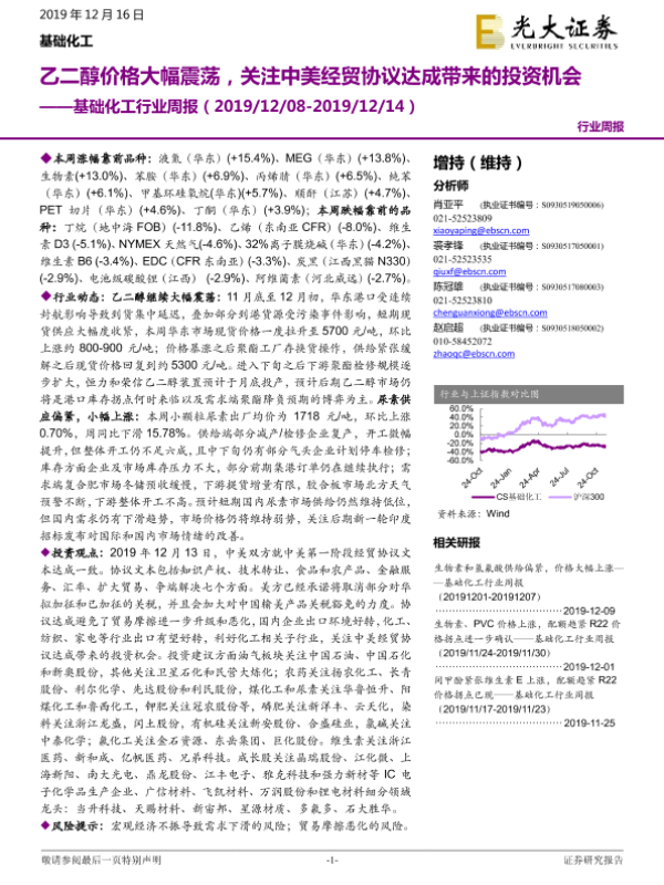 【光大证券】【20191216】基础化工行业周报:乙二醇价格大幅震荡,关注中美经贸协议达成带来的投资机会-19页