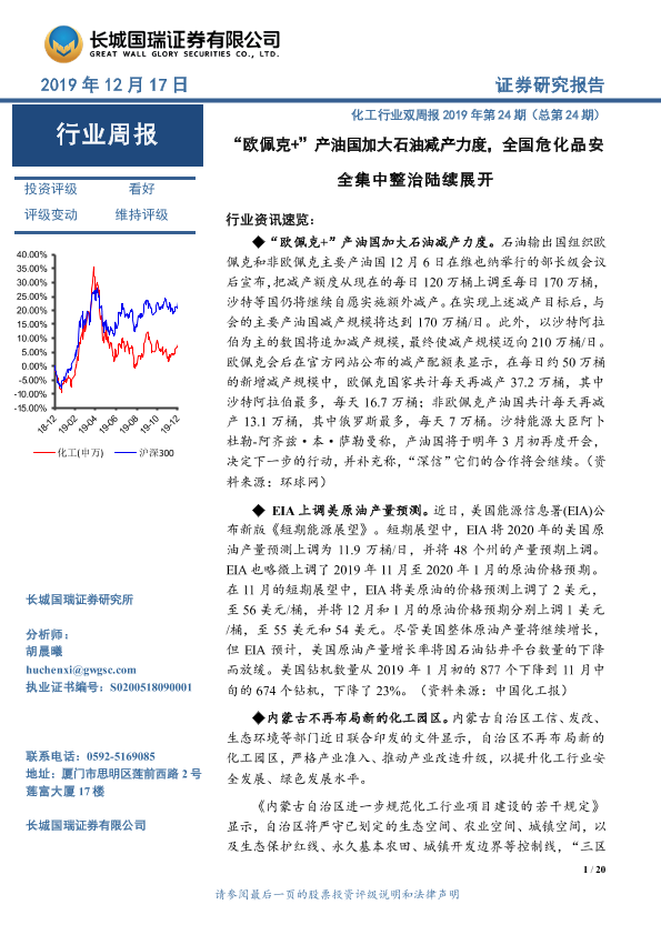 【长城国瑞证券】【20191217】化工行业双周报2019年第24期(总第24期):“欧佩克+”产油国加大石油减产力度,全国危化品安全集中整治陆续展开-20页
