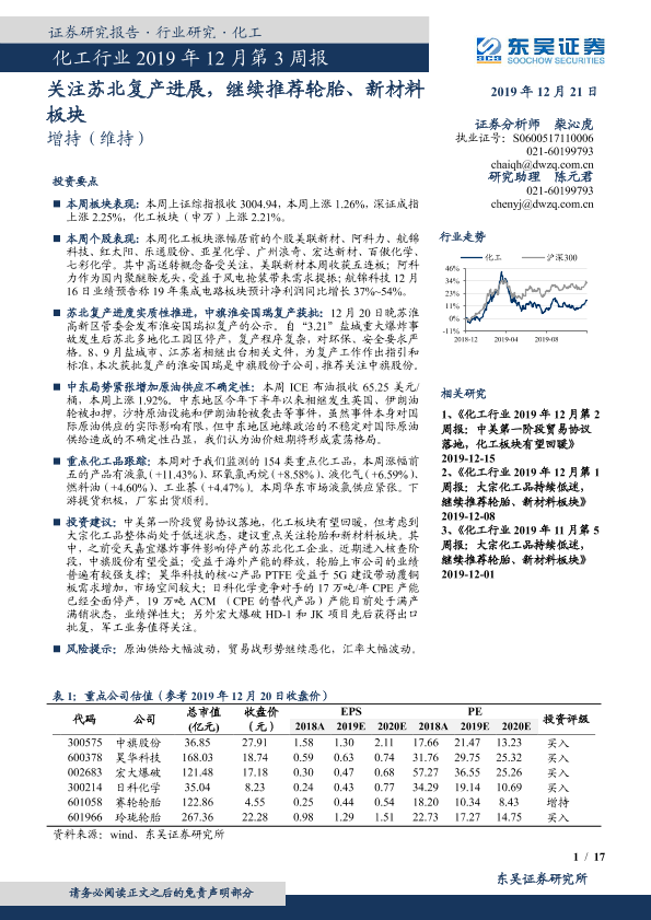 【东吴证券】【20191221】化工行业2019年12月第3周报:关注苏北复产进展,继续推荐轮胎、新材料板块-17页