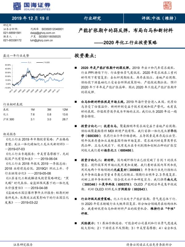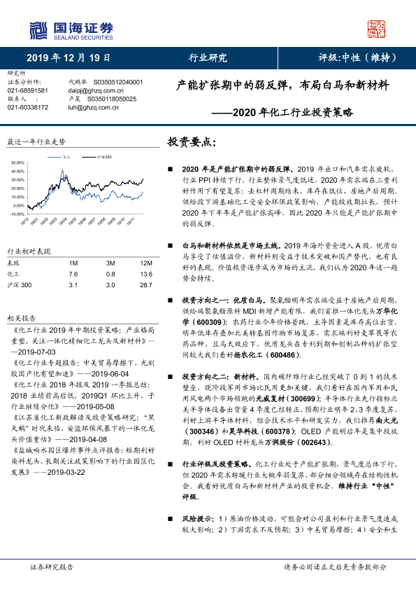 【国海证券】【20191219】2020年化工行业投资策略:产能扩张期中的弱反弹,布局白马和新材料-27页