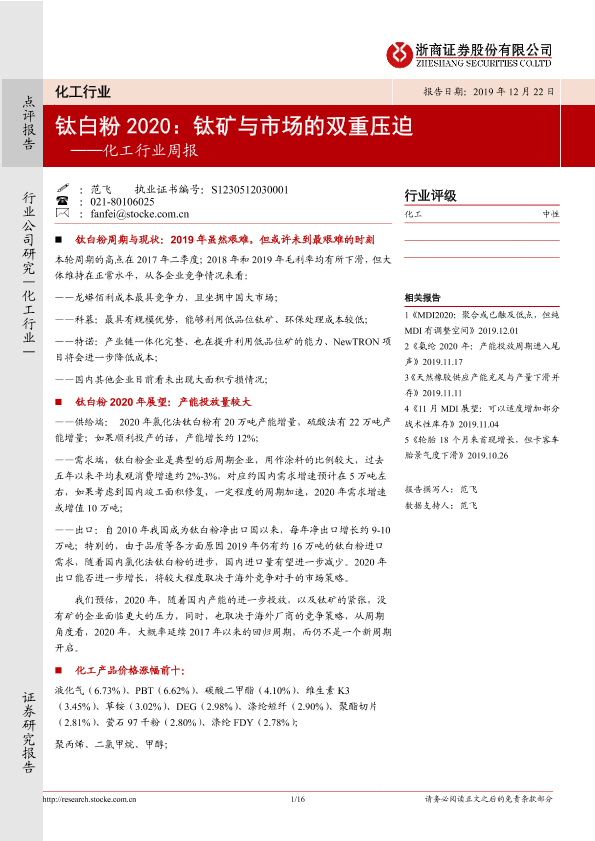 【浙商证券】【20191222】化工行业周报:钛白粉2020:钛矿与市场的双重压迫-16页
