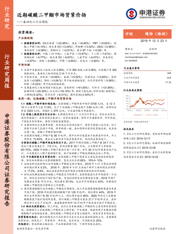 【申港证券】【20191223】20191223-申港证券-基础化工行业周报:近期碳酸二甲酯市场货紧价扬-20页