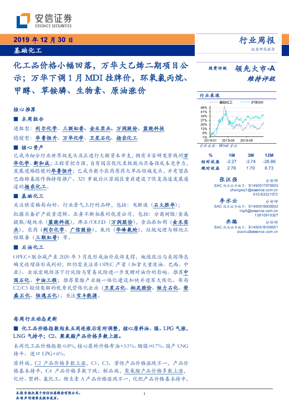 【安信证券】【20191230】基础化工行业周报:化工品价格小幅回落,万华大乙烯二期项目公示;万华下调1月MDI挂牌价,环氧氯丙烷、甲醇、草铵膦、生物素、原油涨价-9页