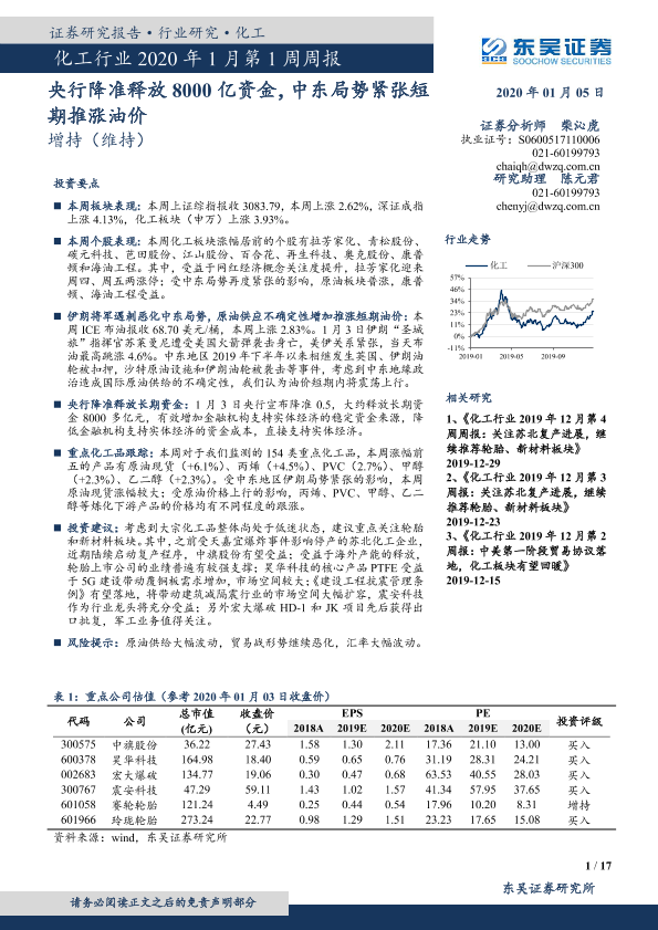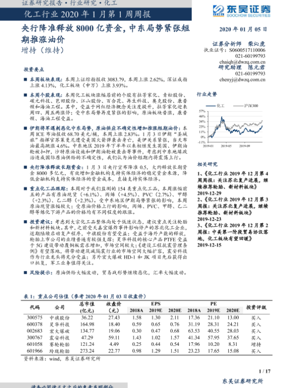 【东吴证券】【20200105】化工行业2020年1月第1周周报:央行降准释放8000亿资金,中东局势紧张短期推涨油价-17页