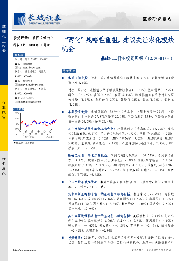 【长城证券】【20200106】20200106-长城证券-基础化工行业投资周报:“两化”战略性重组,建议关注农化板块机会-27页