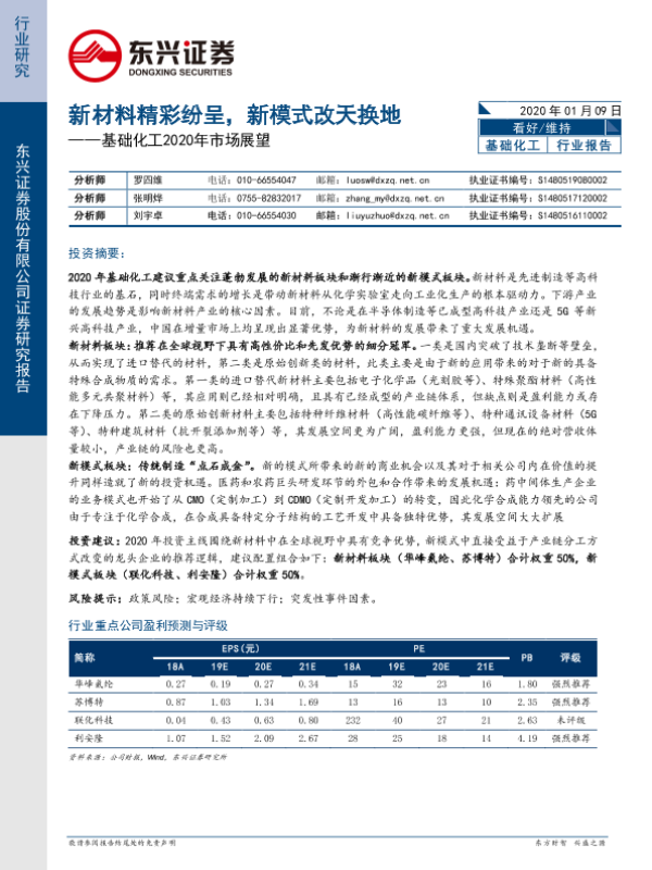 【东兴证券】【20200109】基础化工2020年市场展望:新材料精彩纷呈,新模式改天换地-8页