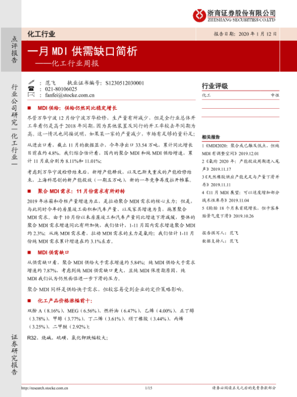 【浙商证券】【20200112】20200112-浙商证券-化工行业周报:一月MDI供需缺口简析-15页