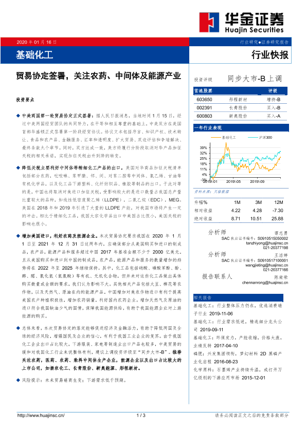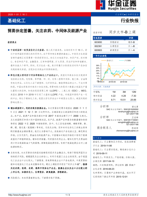 【华金证券】【20200116】基础化工行业快报:贸易协定签署,关注农药、中间体及能源产业-3页