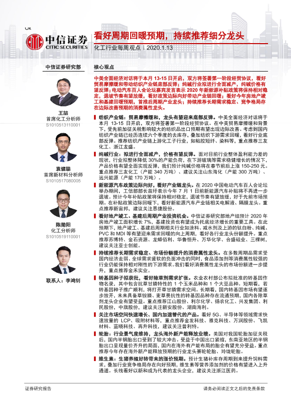 【中信证券】【20200113】20200113-中信证券-化工行业每周观点:看好周期回暖预期,持续推荐细分龙头-27页