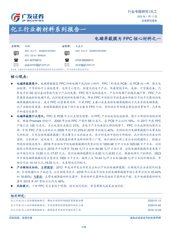 【广发证券】【20200117】化工行业新材料系列报告一:电磁屏蔽膜为FPC核心材料之一-10页
