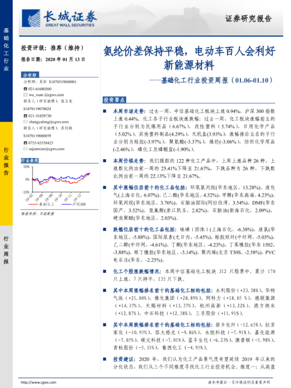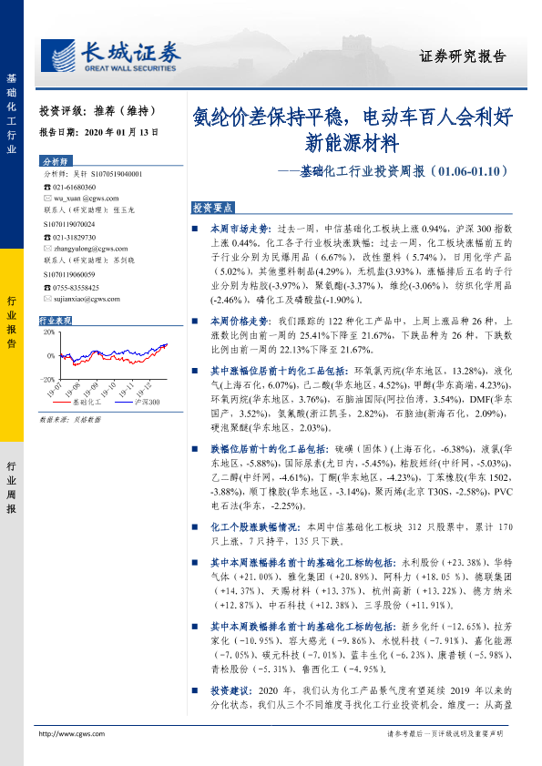 【长城证券】【20200113】基础化工行业投资周报:氨纶价差保持平稳,电动车百人会利好新能源材料-26页