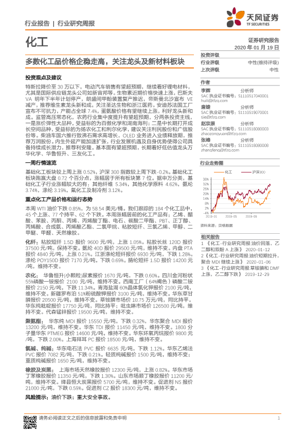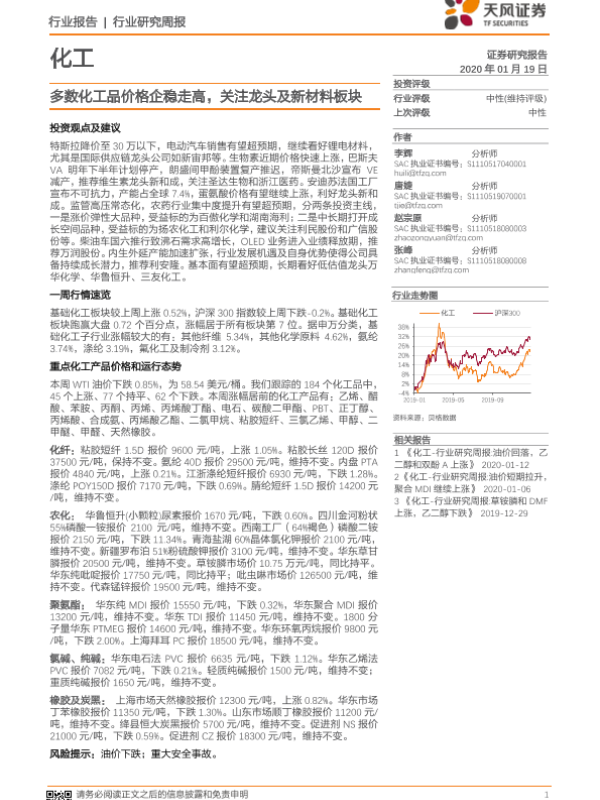 【天风证券】【20200119】20200119-天风证券-化工行业研究周报:多数化工品价格企稳走高,关注龙头及新材料板块-17页