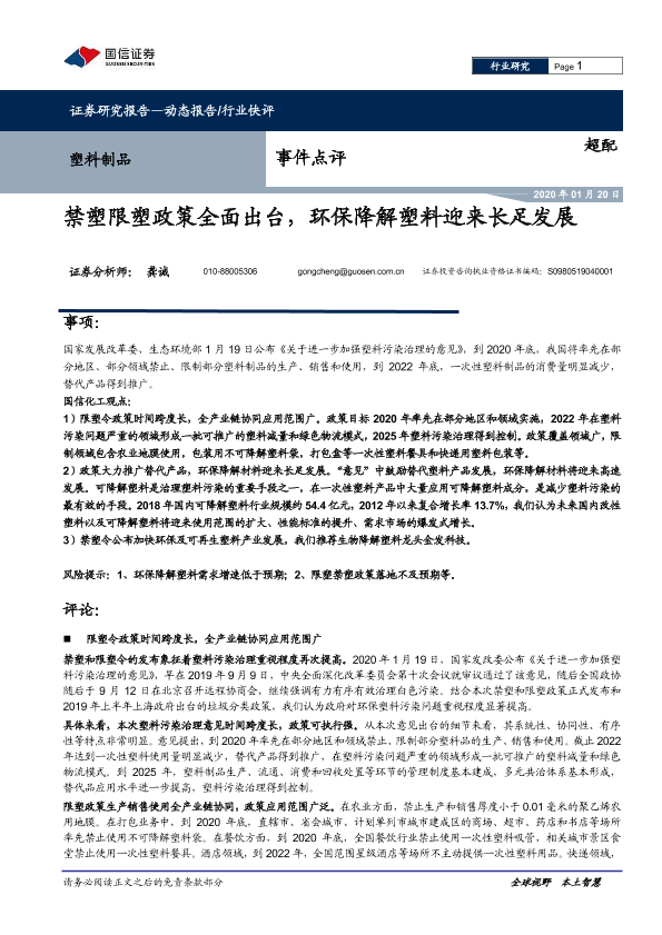 【国信证券】【20200120】塑料制品事件点评:禁塑限塑政策全面出台,环保降解塑料迎来长足发展-6页
