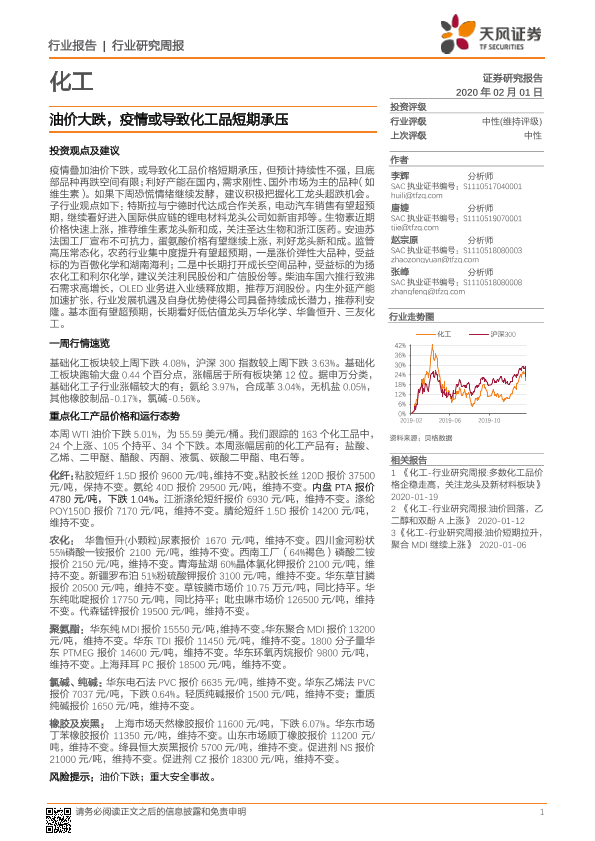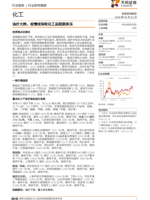 【天风证券】【20200201】20200201-天风证券-化工行业研究周报:油价大跌,疫情或导致化工品短期承压-17页