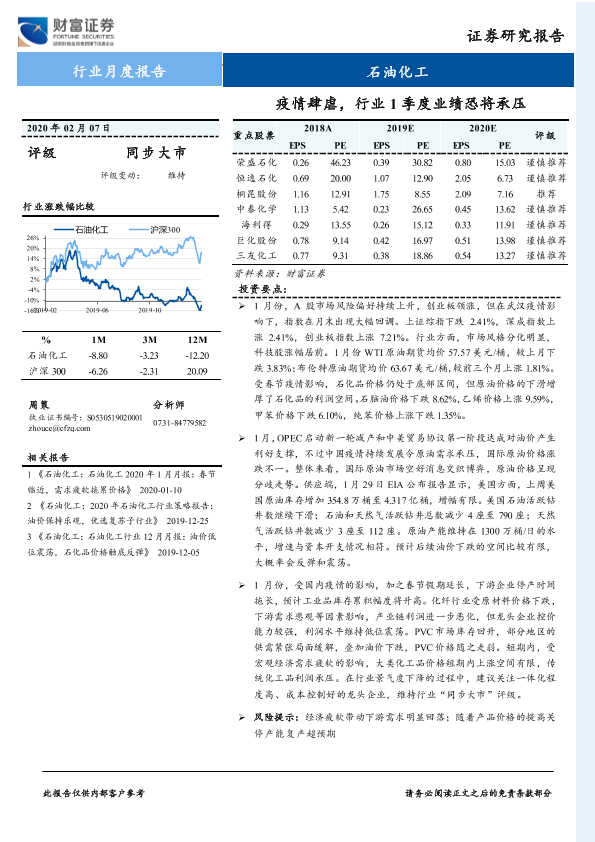 【财信证券】【20200207】财信证券-石油化工行业月度报告:疫情肆虐,行业1季度业绩恐将承压-11页