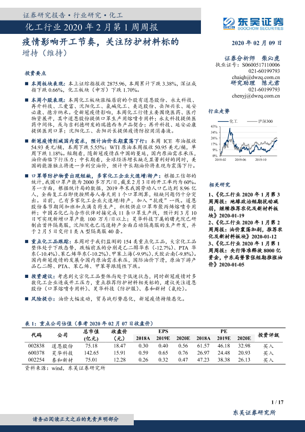 【东吴证券】【20200209】化工行业2020年2月第1周周报:疫情影响开工节奏,关注防护材料标的-17页
