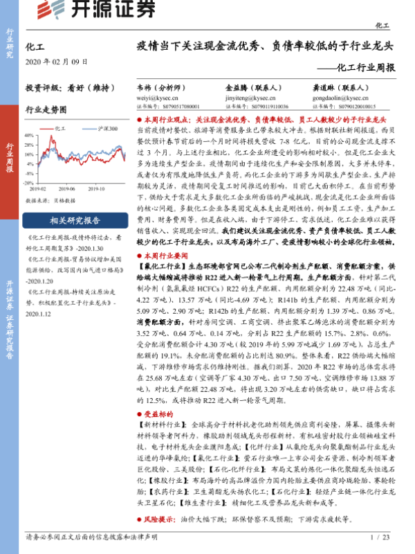 【开源证券】【20200209】20200209-开源证券-化工行业周报:疫情当下关注现金流优秀、负债率较低的子行业龙头-23页