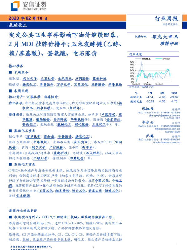 【安信证券】【20200210】基础化工行业周报:突发公共卫生事件影响下油价继续回落,2月MDI挂牌价持平;玉米发酵链(乙醇、赖氨酸)、蛋氨酸、电石涨价-9页