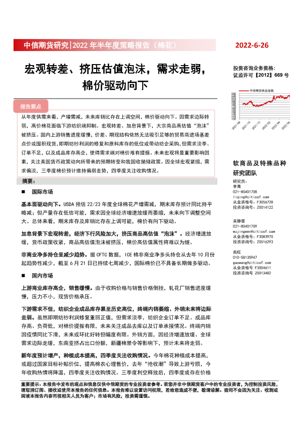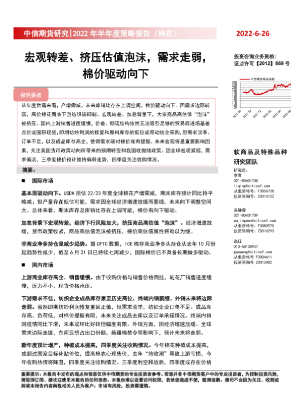 【中信期货】【20220626】2022年半年度策略报告(棉花):宏观转差、挤压估值泡沫,需求走弱,棉价驱动向下-20页