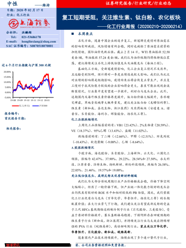 【上海证券】【20200217】20200217-上海证券-化工行业周报:复工短期受阻,关注维生素、钛白粉、农化板块-18页