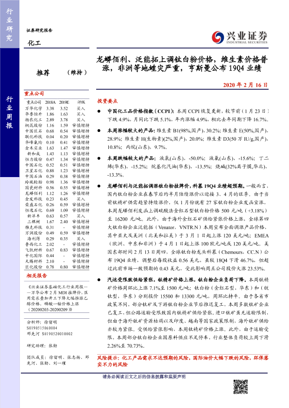 【兴业证券】【20200216】20200216-兴业证券-化工行业周报:龙蟒佰利、泛能拓上调钛白粉价格,维生素价格普涨,非洲等地蝗灾严重,亨斯曼公布19Q4业绩-35页