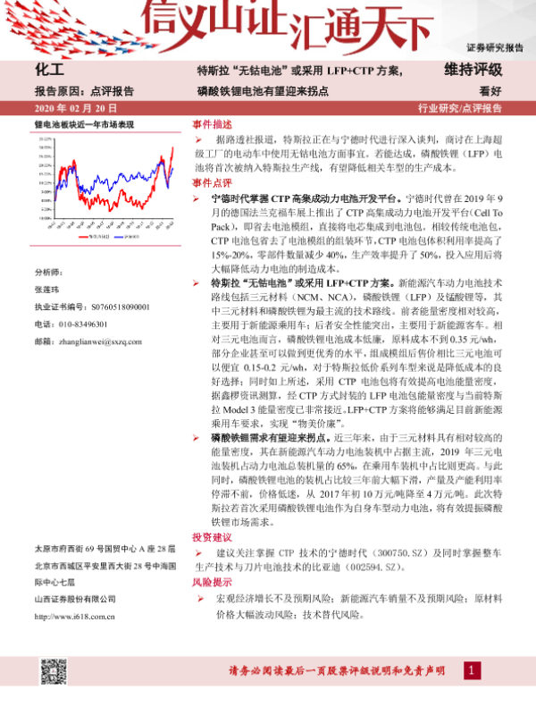 【山西证券】【20200220】化工:特斯拉“无钴电池”或采用LFP+CTP方案,磷酸铁锂电池有望迎来拐点-2页
