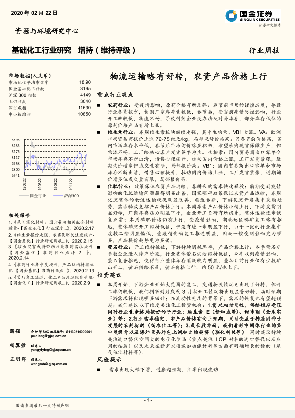 【国金证券】【20200222】基础化工行业研究:物流运输略有好转,农资产品价格上行-15页