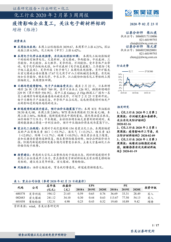 【东吴证券】【20200223】化工行业2020年2月第3周周报:疫情影响企业复工,关注电子新材料标的-17页