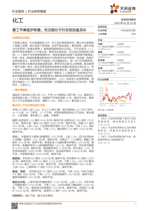 【天风证券】【20200223】20200223-天风证券-化工行业研究周报:复工节奏逐步恢复,关注细分子行业低估值龙头-17页