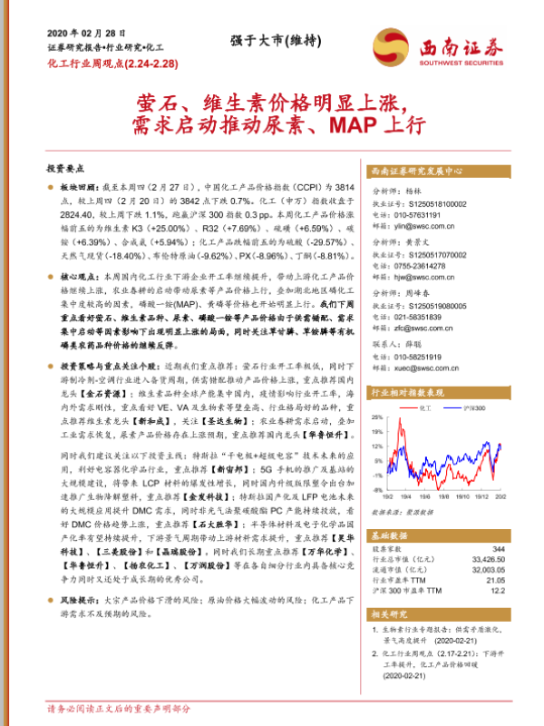 【西南证券】【20200228】20200228-西南证券-化工行业周观点:萤石、维生素价格明显上涨,需求启动推动尿素、MAP上行-8页