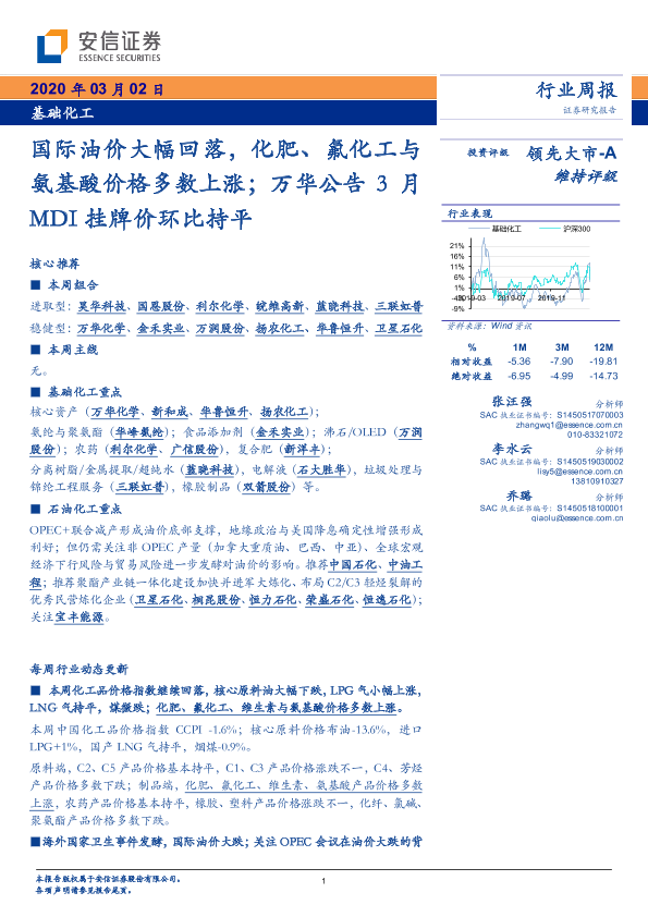 【安信证券】【20200302】基础化工行业周报:国际油价大幅回落,化肥、氟化工与氨基酸价格多数上涨;万华公告3月MDI挂牌价环比持平-9页