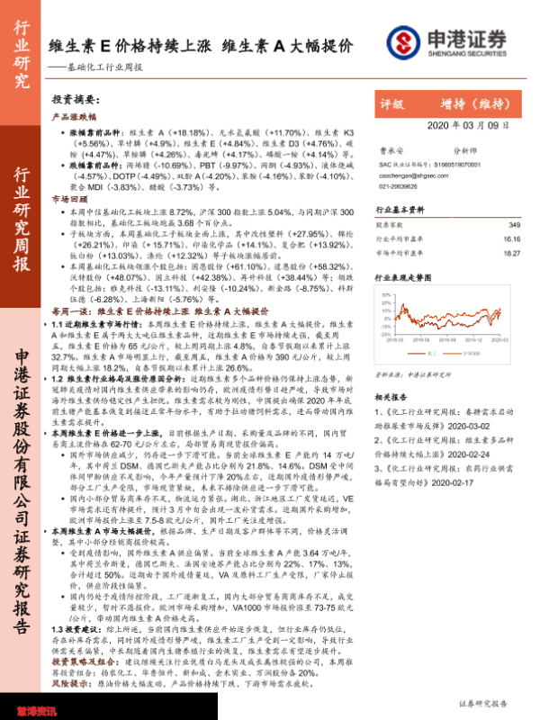 【申港证券】【20200309】20200309-申港证券-基础化工行业周报:维生素E价格持续上涨 维生素A大幅提价-18页