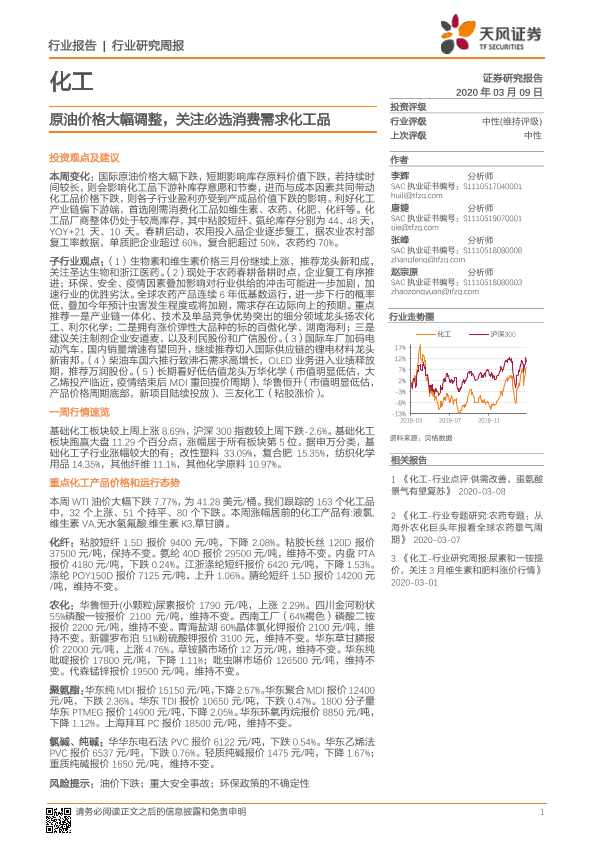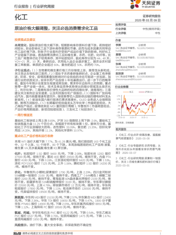 【天风证券】【20200309】20200309-天风证券-化工行业研究周报:原油价格大幅调整,关注必选消费需求化工品-15页