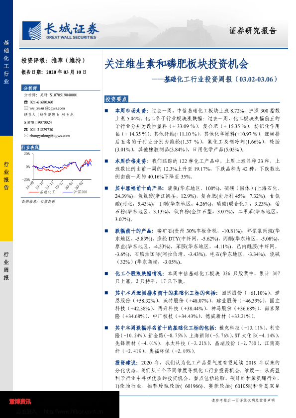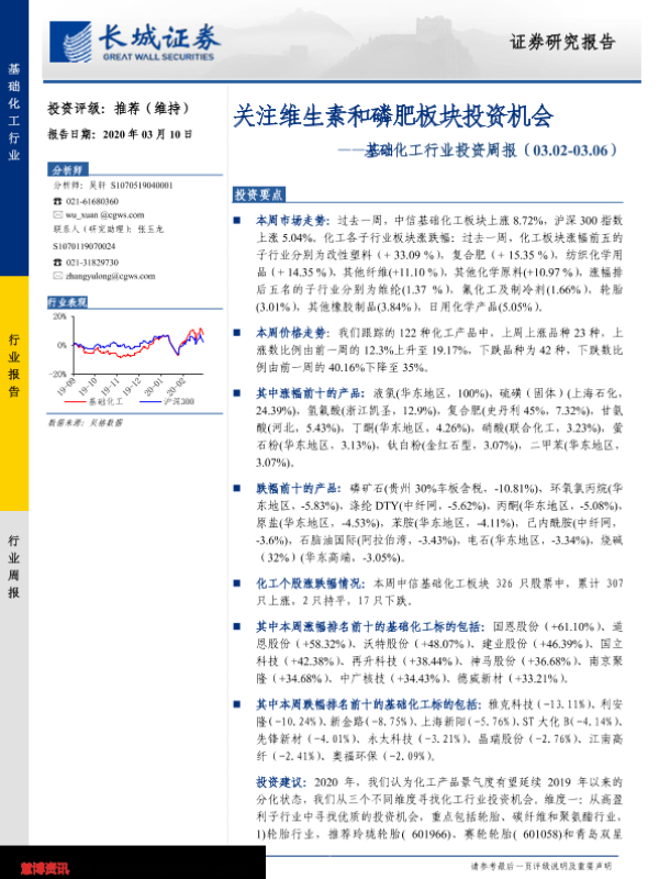 【长城证券】【20200310】基础化工行业投资周报:关注维生素和磷肥板块投资机会-26页