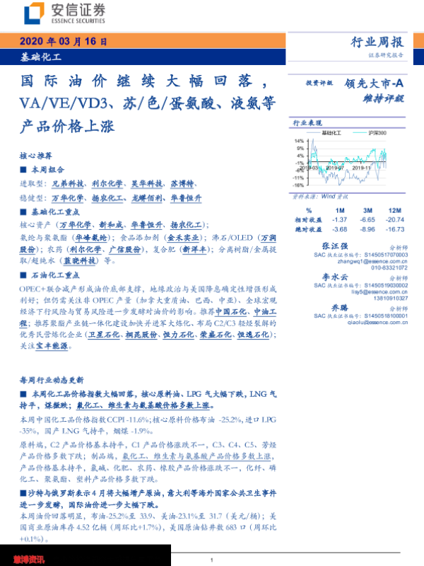 【安信证券】【20200316】20200316-安信证券-基础化工行业周报:国际油价继续大幅回落,VA VE VD3、苏 色 蛋氨酸、液氨等产品价格上涨-10页