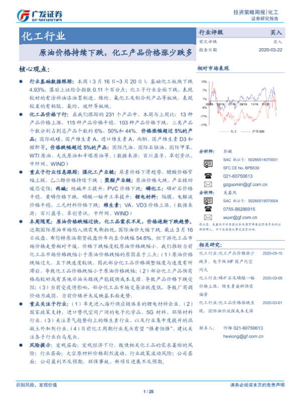 【广发证券】【20200322】20200322-广发证券-化工行业投资策略周报:原油价格持续下跌,化工产品价格涨少跌多-25页