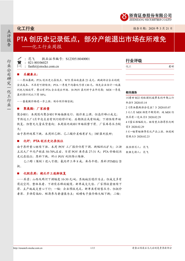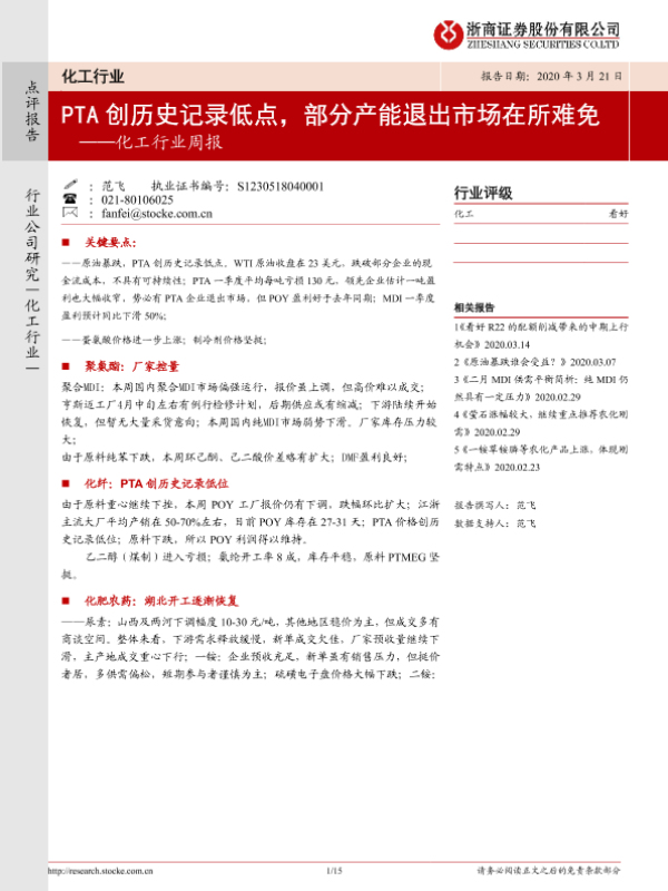 【浙商证券】【20200321】20200321-浙商证券-化工行业周报:PTA创历史记录低点,部分产能退出市场在所难免-15页