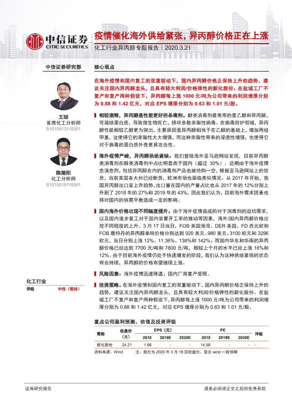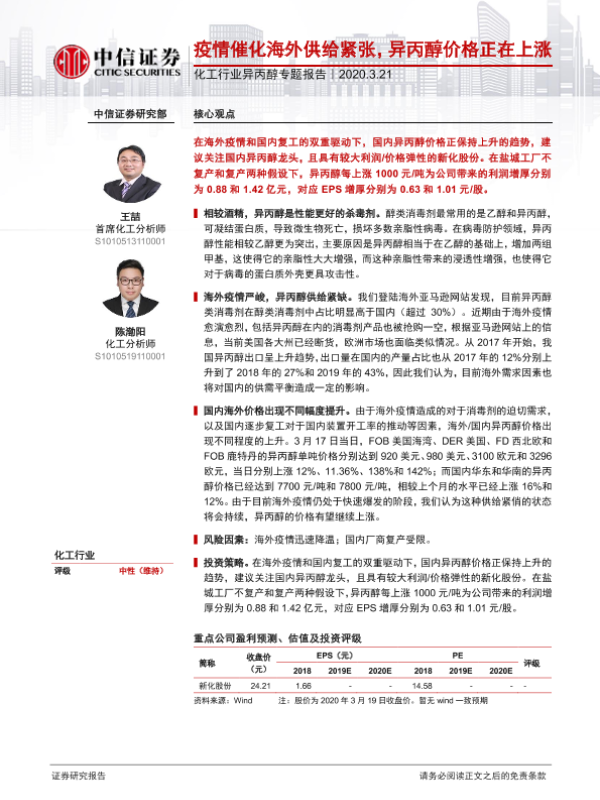 【中信证券】【20200321】疫情催化海外供给紧张,异丙醇价格正在上涨-8页
