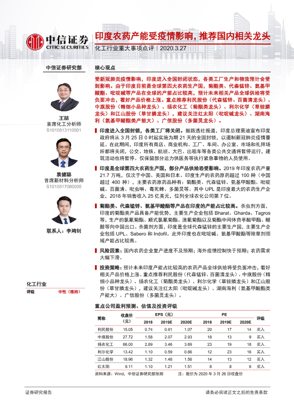 【中信证券】【20200327】化工行业重大事项点评:印度农药产能受疫情影响,推荐国内相关龙头-3页