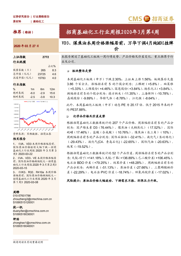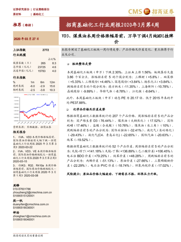 【海通证券】【20200327】招商基础化工行业周报2020年3月第4周:VD3、煤焦油本周价格涨幅居前,万华下调4月纯MDI挂牌价-17页