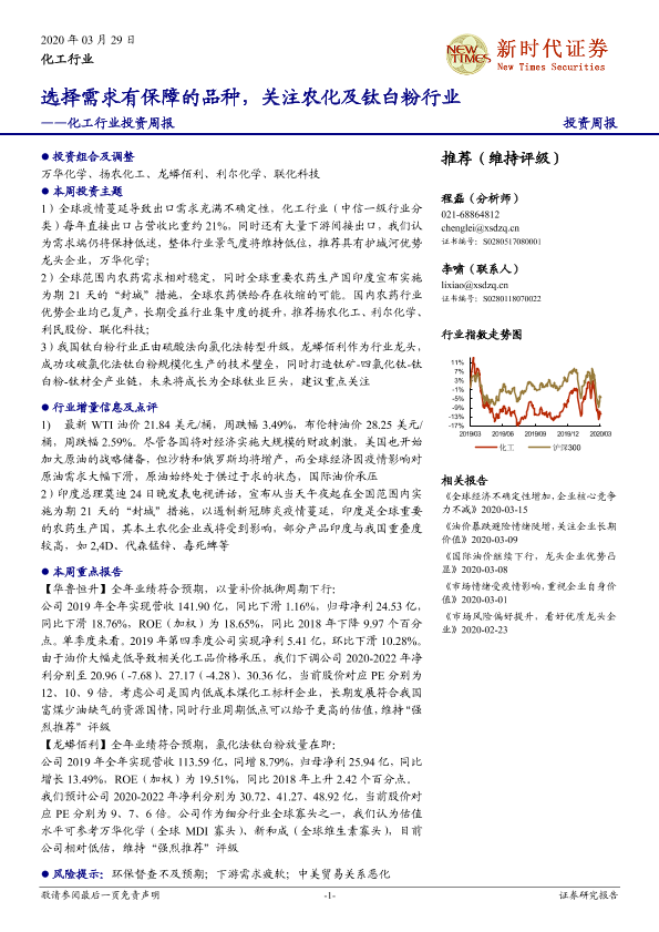 【新时代证券】【20200329】20200329-新时代证券-化工行业投资周报:选择需求有保障的品种,关注农化及钛白粉行业-19页